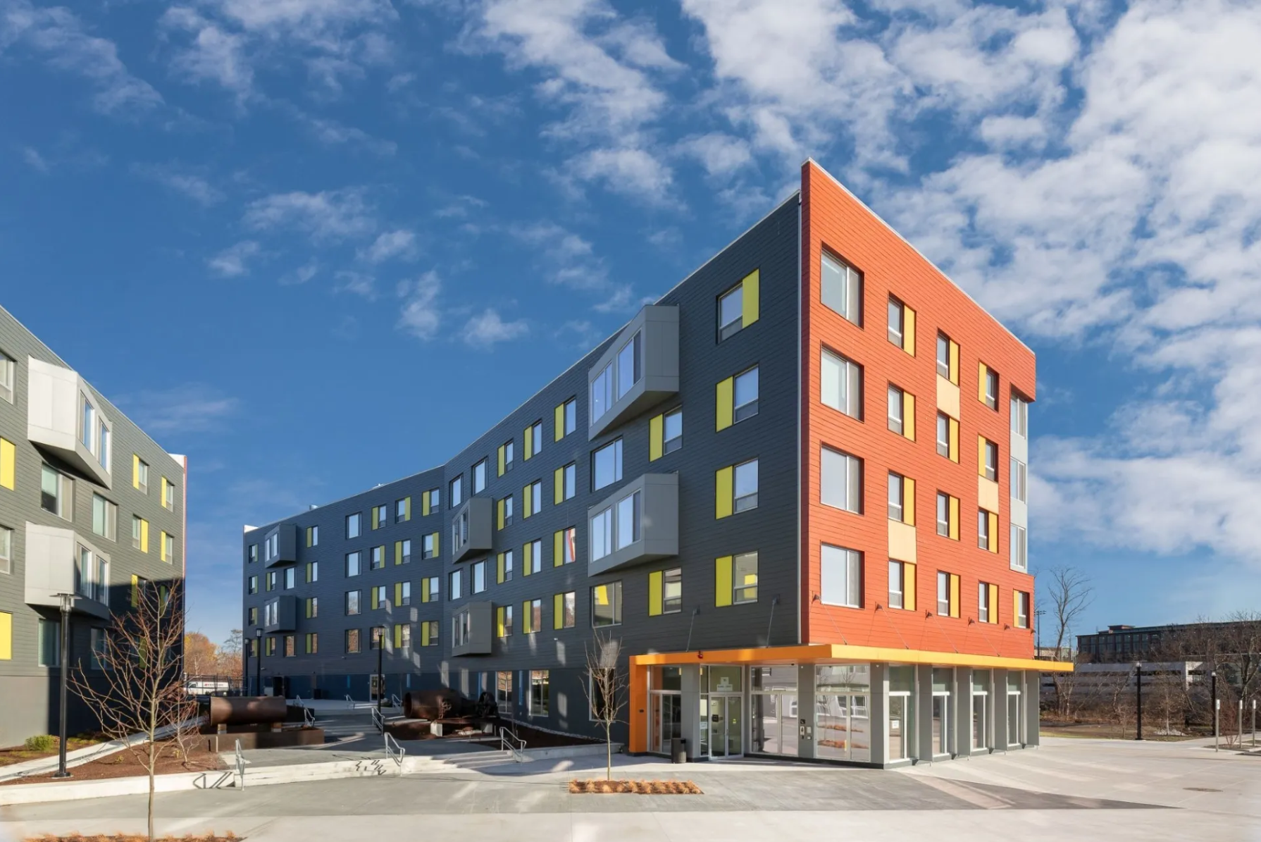 With building geometries inspired by the complex shots and angles of the game of squash, the New Balance SquashBusters Center includes eight squash courts, classroom, fitness, gathering, and office space. The project adjoins eighty units of new construction affordable housing.